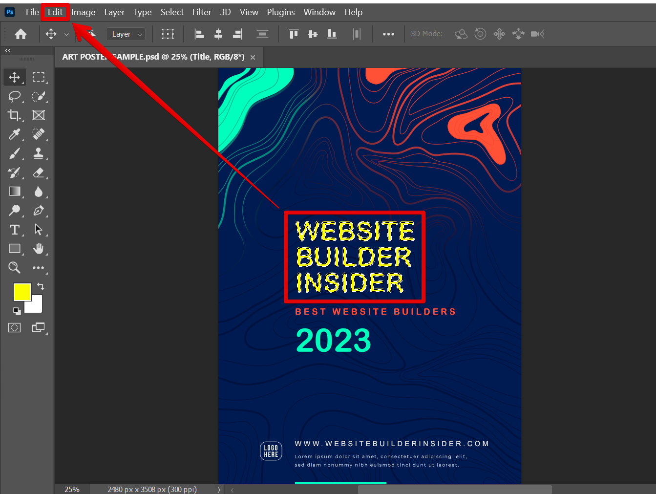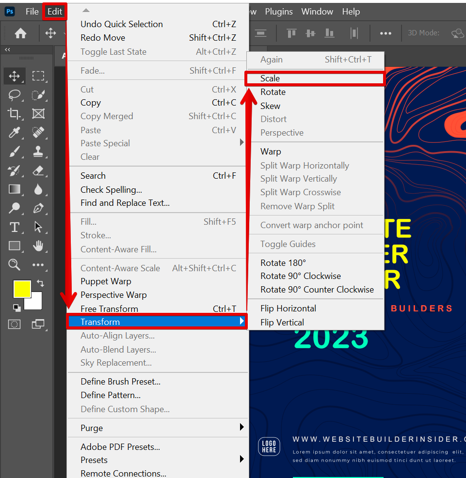 From there, go to the Edit menu and select Transform > Scale to enable the handles around the text. You can also use the keyboard shortcut “Ctrl+T” for this.