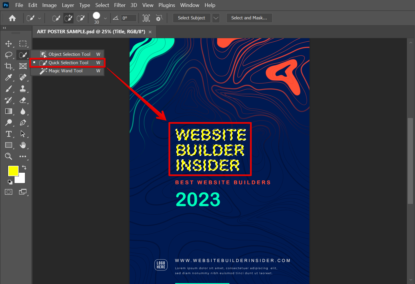 To use the “Quick Selection” tool, simply click on it in the toolbar and then click and drag over the area of the image that contains the text you want to select. The “Quick Selection” tool will automatically select all similar pixels in the area you dragged over.