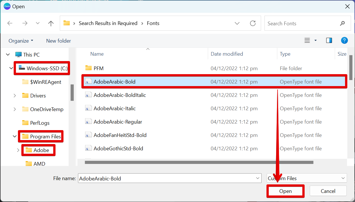 In the File Manager window that will appear, go to the location of your Program Files folder and open the Adobe folder. Here, search for the Fonts folder and open it. From there, select the Adobe font that you wish to add to your Canva account.