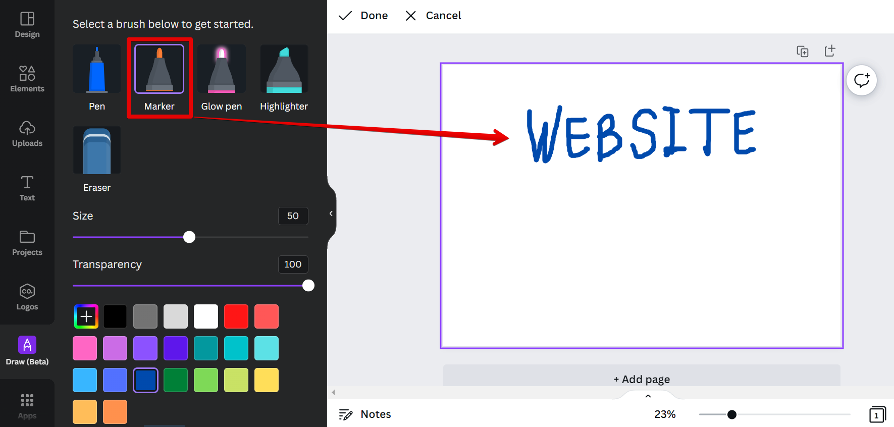 Yes! You can free draw in Canva using the Draw Application. Just select one from the brush options available such as ‘Pen’, ‘Marker’, ‘Glow Pen’, and ‘Highlighter’, and use it to draw on your canvas. You can change the color, thickness, and opacity of your pen, and you can also erase your drawing if you make a mistake.