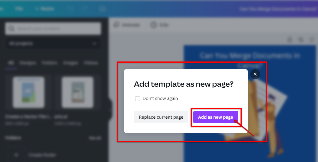 Warning: Please be aware that merging documents in Canva can result in formatting issues and lost data. We recommend only merging documents that have been created in Canva, and that you merge them one at a time.