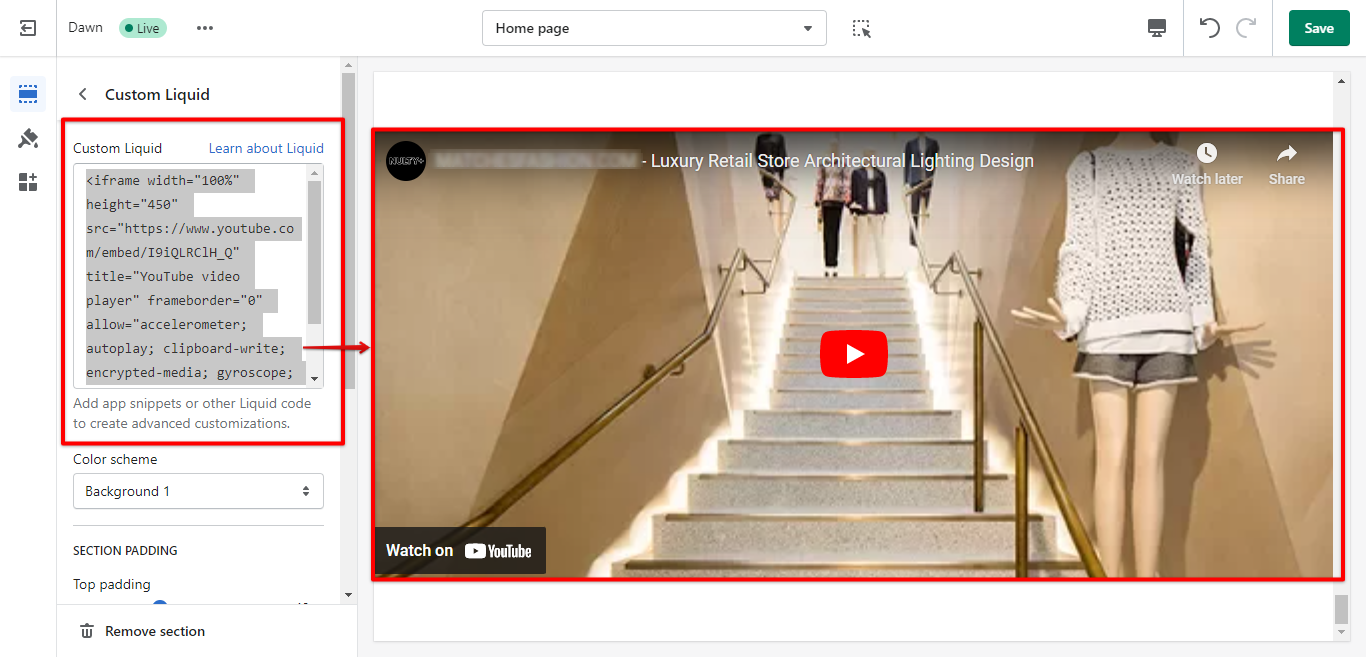The second method is to use an external video hosting service, such as YouTube or Vimeo. To use an external video hosting service, first, upload your MP4 video file to the service of your choice, then copy and paste the video’s embed code into the “Embed Code” field on your product page. Or add a “Custom Liquid” section and paste your embed code link at the code editor field.