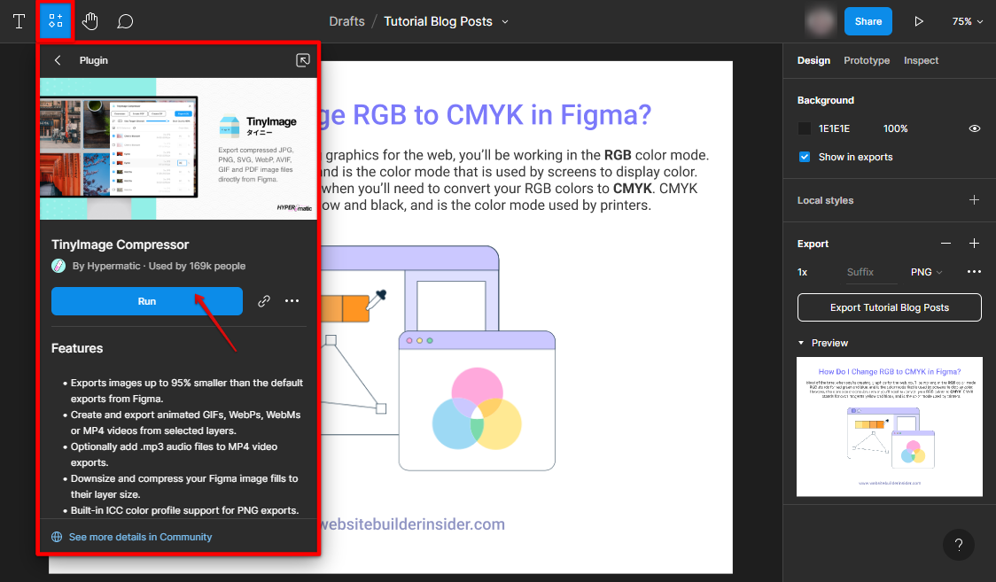 First, go to Figma “Resources” icon, go to the plugin tab and search for the “TinyImage Compressor” plugin then click “Run” to start