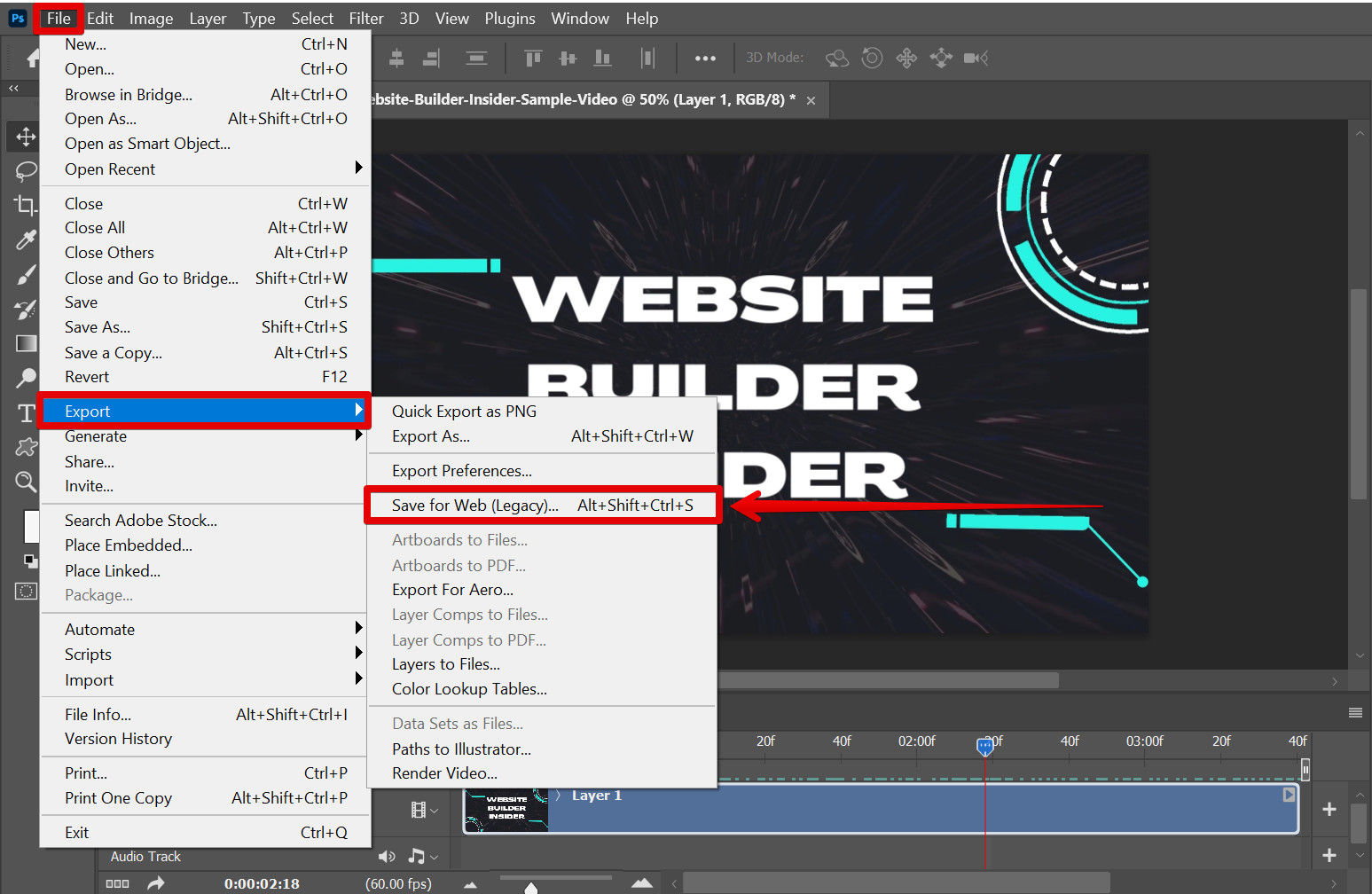 There are a number of ways to convert an MP4 to a GIF in Photoshop, but the most common and straightforward way is to use the ‘Save for Web‘ function. This can be found in the File menu, under ‘Export‘.