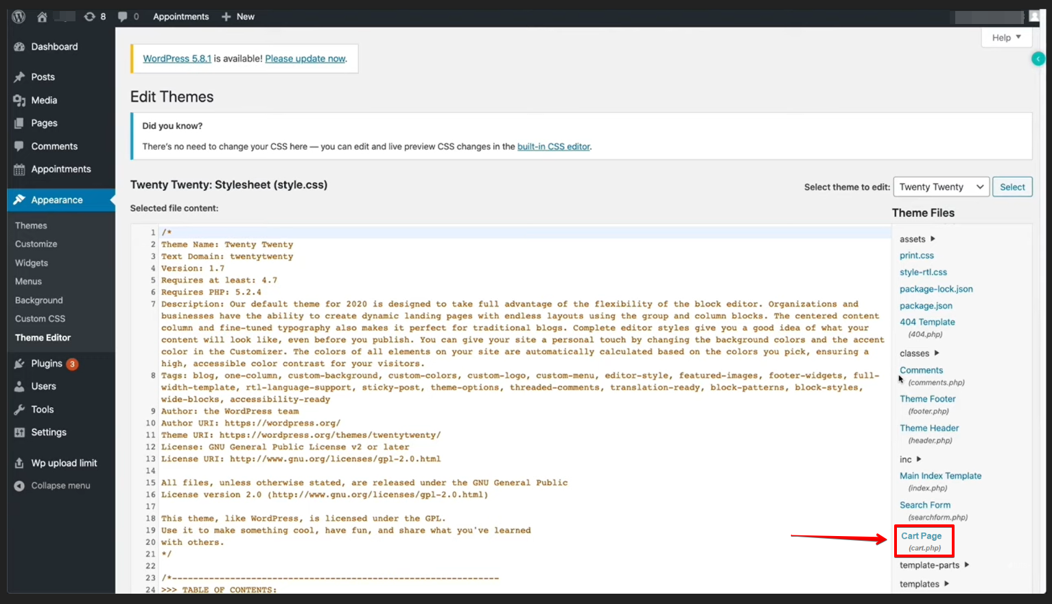 - On the right side of the screen, you’ll see a list of files. Find the one labeled “cart.php” and click on it.