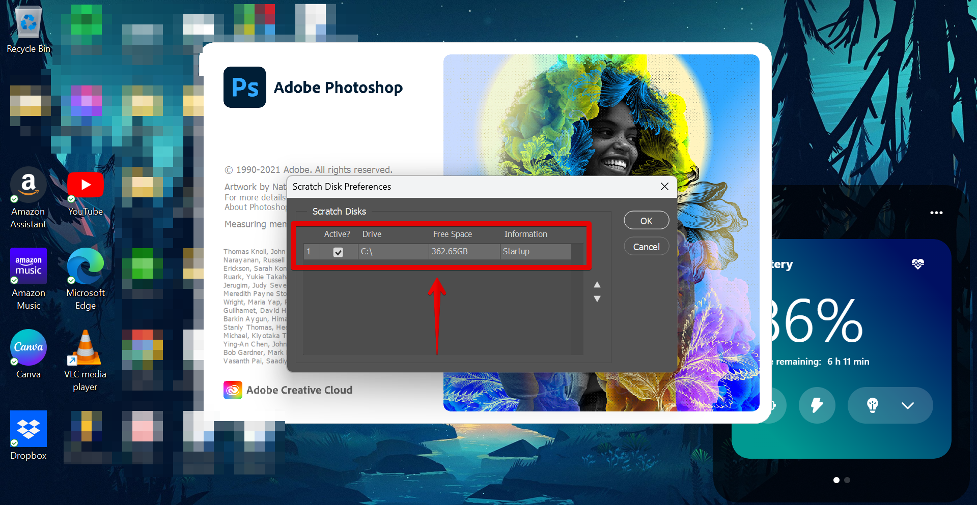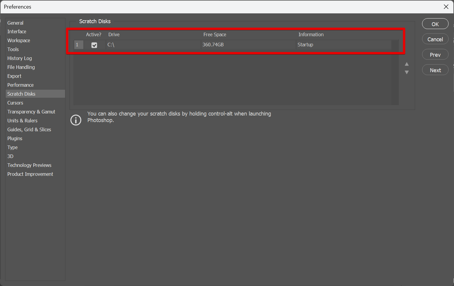 Here you can find all the available Scratch Disks where you can save your Photoshop files. You can use this to empty your Scratch Disk or simply choose another one with more free space.