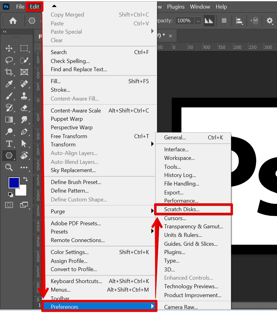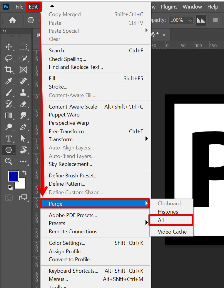If Photoshop is already open but you’re not able to use it because of your full Scratch Disk, then go to Edit > Purge > All. This will let you delete the files in your Scratch Disk.