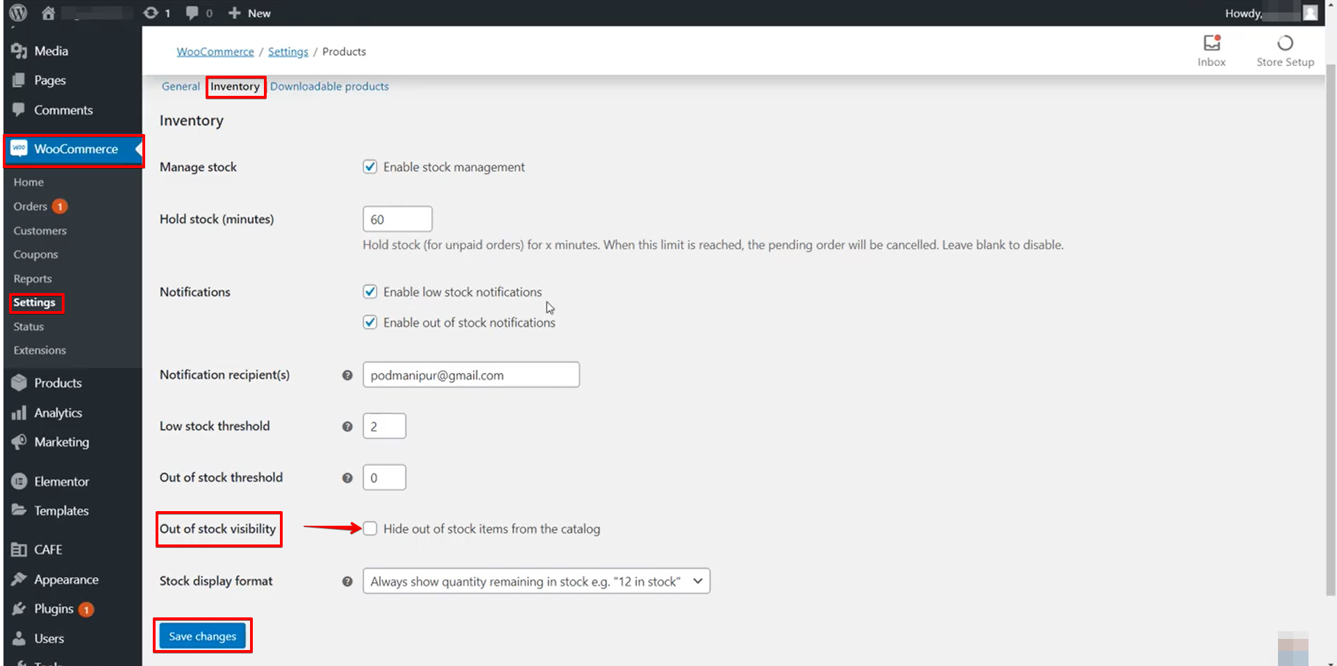 1. Log in to your WordPress Dashboard and go to WooCommerce > Settings. On the General tab, scroll down to the Inventory section and click on the Hide out of stock items from the catalog checkbox.