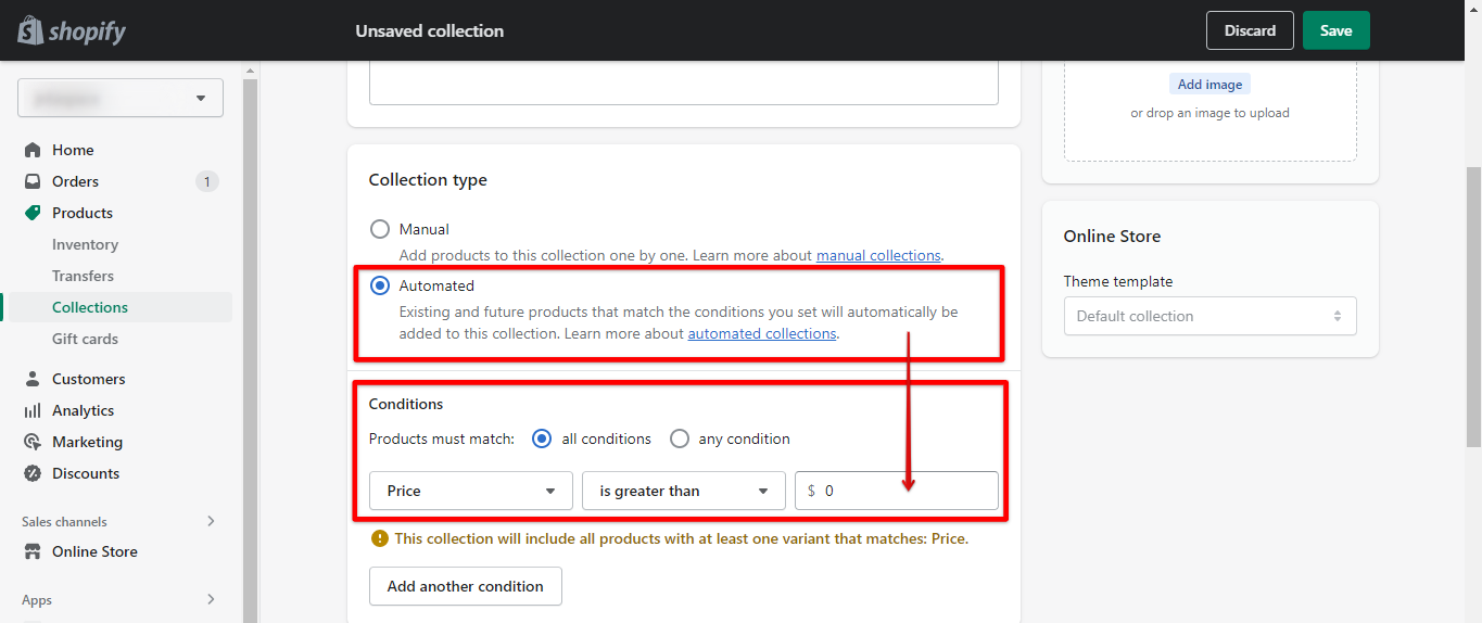 Then, set the Collection type to “Automated” and add a “Price” variant condition. Setting up a price condition that is greater than $0 ensures that whatever products you add to your Shopify store in the future will be part of your “All Products” collection. Don’t forget to click “Save” once you’re done. And that’s it! You can now display all your items on one page at your Shopify store.