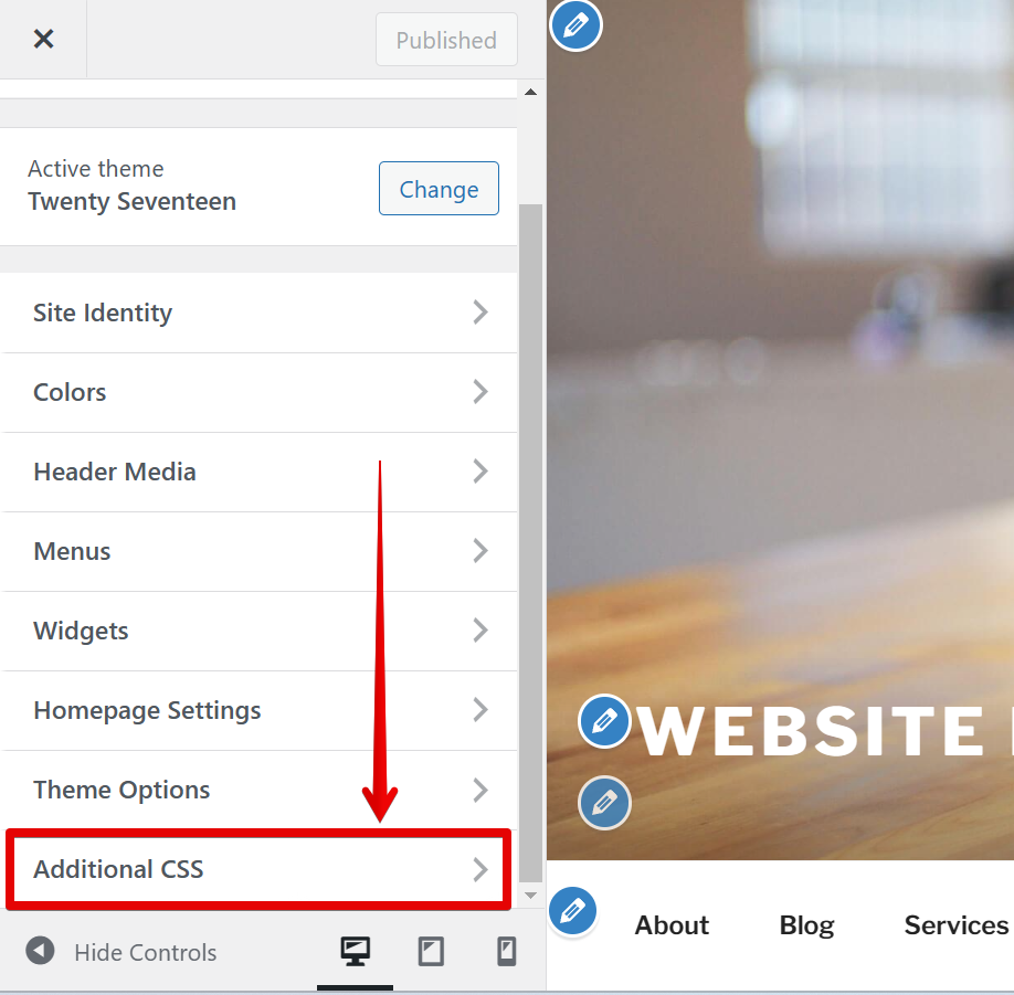 2. Now you’ll need to add some additional CSS to override the default behavior of your site. To do this, on the new page where you’ll be redirected, scroll down and select “Additional CSS” from the options.