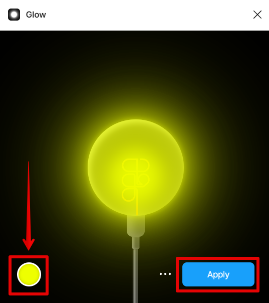 2. In the Glow plugin window, choose the color of the glow by clicking on the circle icon at the lower left part. Then, adjust the intensity of the glow by clicking and dragging up and down on the light bulb shown in the window. Once done, click on the “Apply” button.