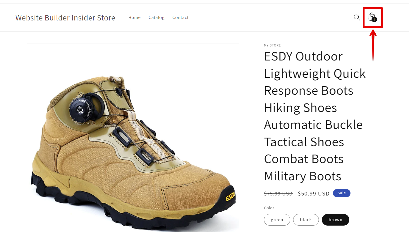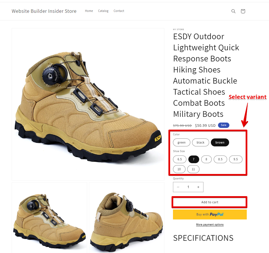 On the product page, you’ll see different variants of the product (if there are any). For example, if you’re buying a shirt, you’ll be able to choose the size, color, and other options. Select the variant you want and then click “Add to cart.”
