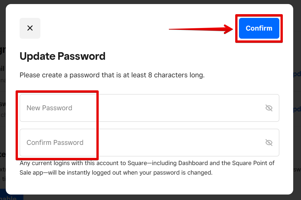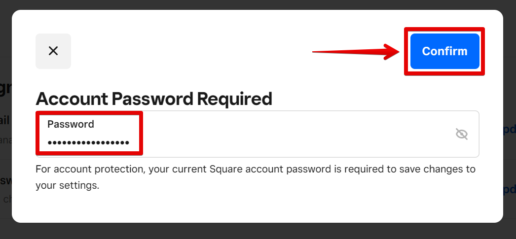 A new window will then appear, and you will be prompted to enter your account’s password before making changes. Input your current password in the provided field and click the “Confirm” button.
