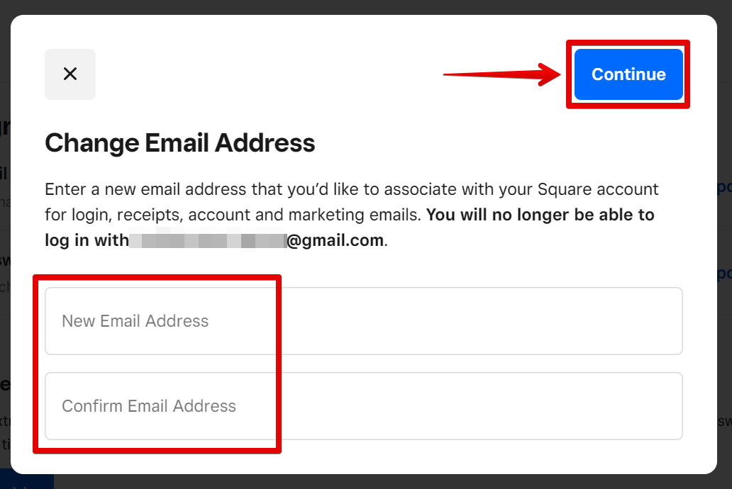 In the pop-up window that will appear, enter the new email address that you want to transfer the account to, and then confirm it. Once done, click on the “Continue” button.