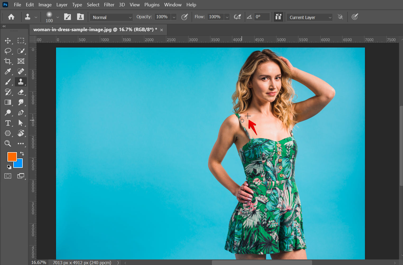 Once the area is selected, you can now choose the part of the image that you want to cover up using the cloned area. This is what we will use to remove clothes from the image. Just click and drag on the clothes part that you want to remove. You can also see here already the effect of the Clone Stamp Tool once used.