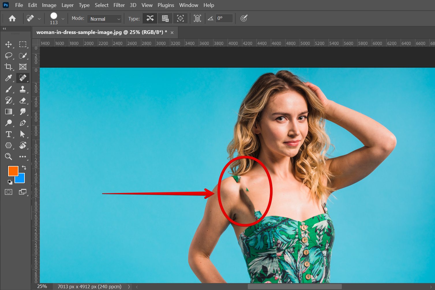 This will be the effect of one stroke using the Spot Healing Brush Tool to remove clothes.