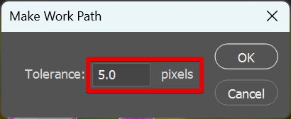 In the Make Work Path dialog box that will pop up, we need to set the Tolerance of the path. In this example, we will set the tolerance to 5 pixels.