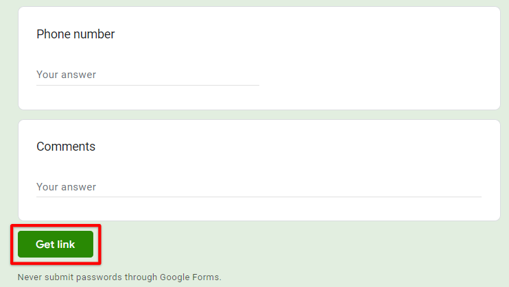 Then at the bottom of your form, click the Get link button to copy the address of your Google Form.