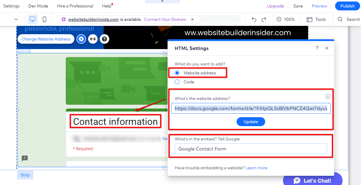 Then, in the dialog box that appears, click the Website Address option and paste your google form copied link at the input field. Click Apply or Update to save the changes and now you should see the form embedded in your Wix site. Finally, customize the form to your preferences.