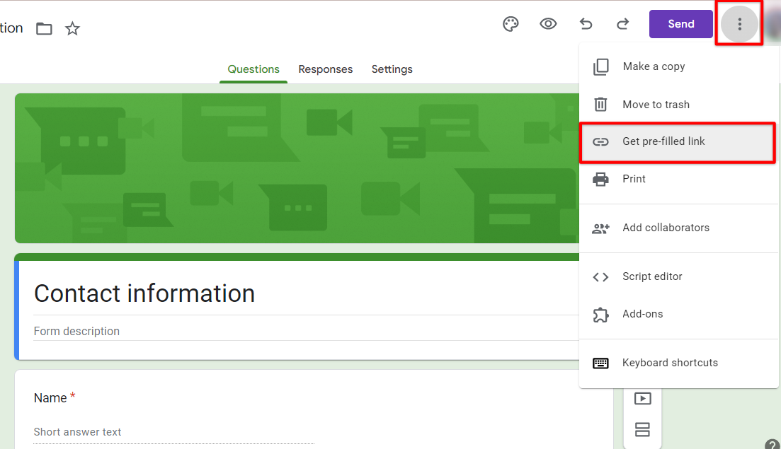 Simply go to your Google Forms and click the Actions button to get the Pre-filled Link.