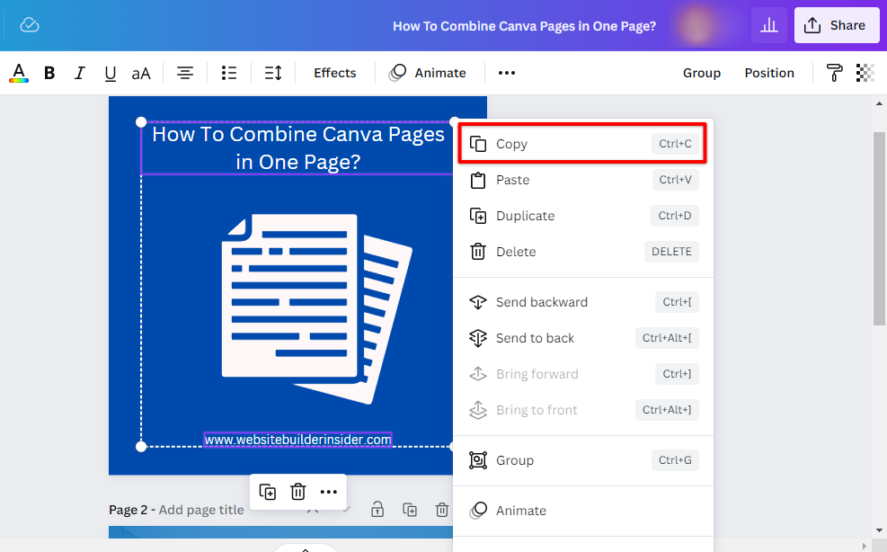 Another way to combine Canva pages is to use the “Copy” and “Paste” commands. To do this, select the objects on the first page that you want to copy, then press “Ctrl+C” to copy them.
