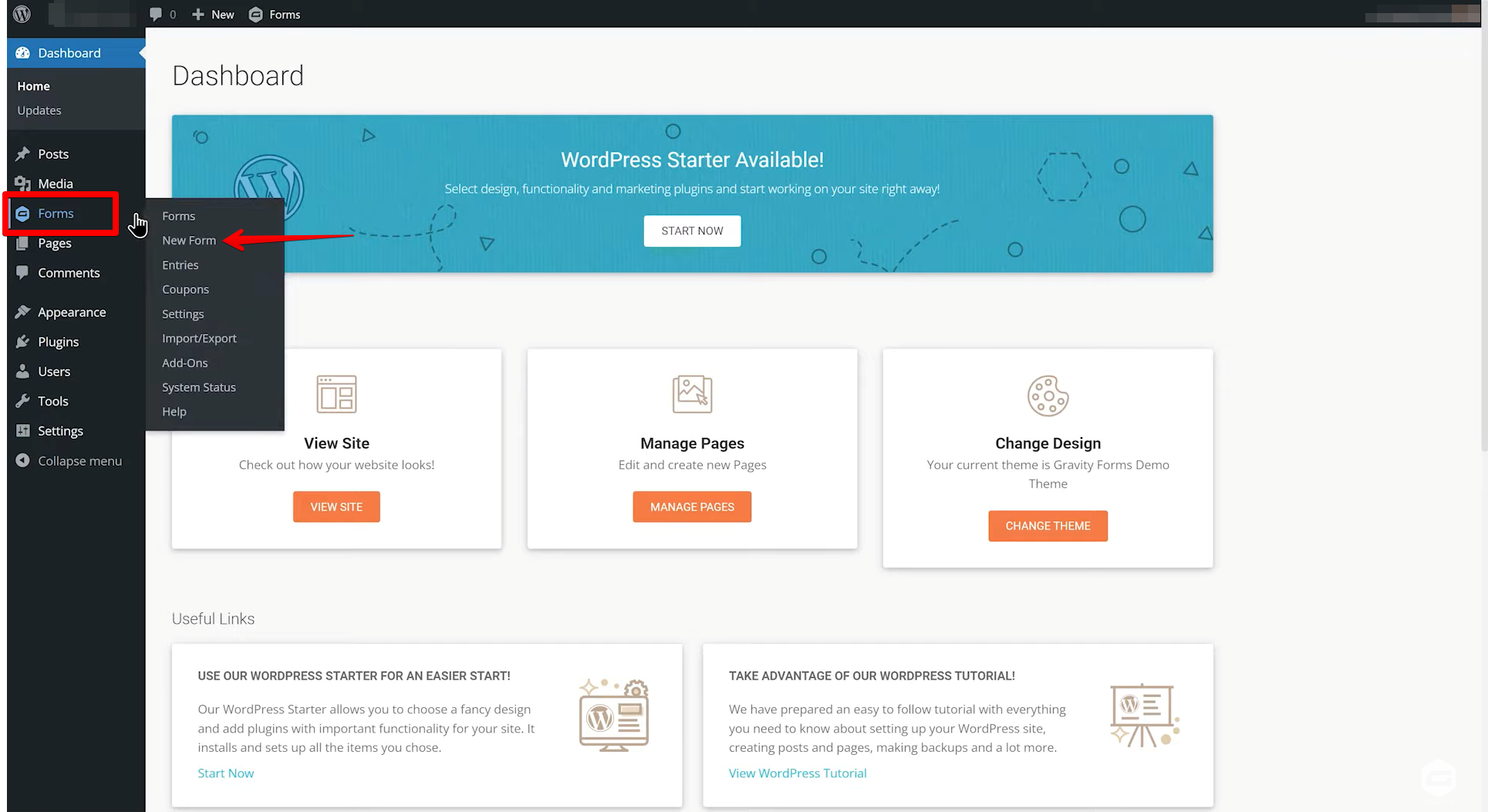 - Go to the WordPress dashboard and select “Forms” > “New Form“.