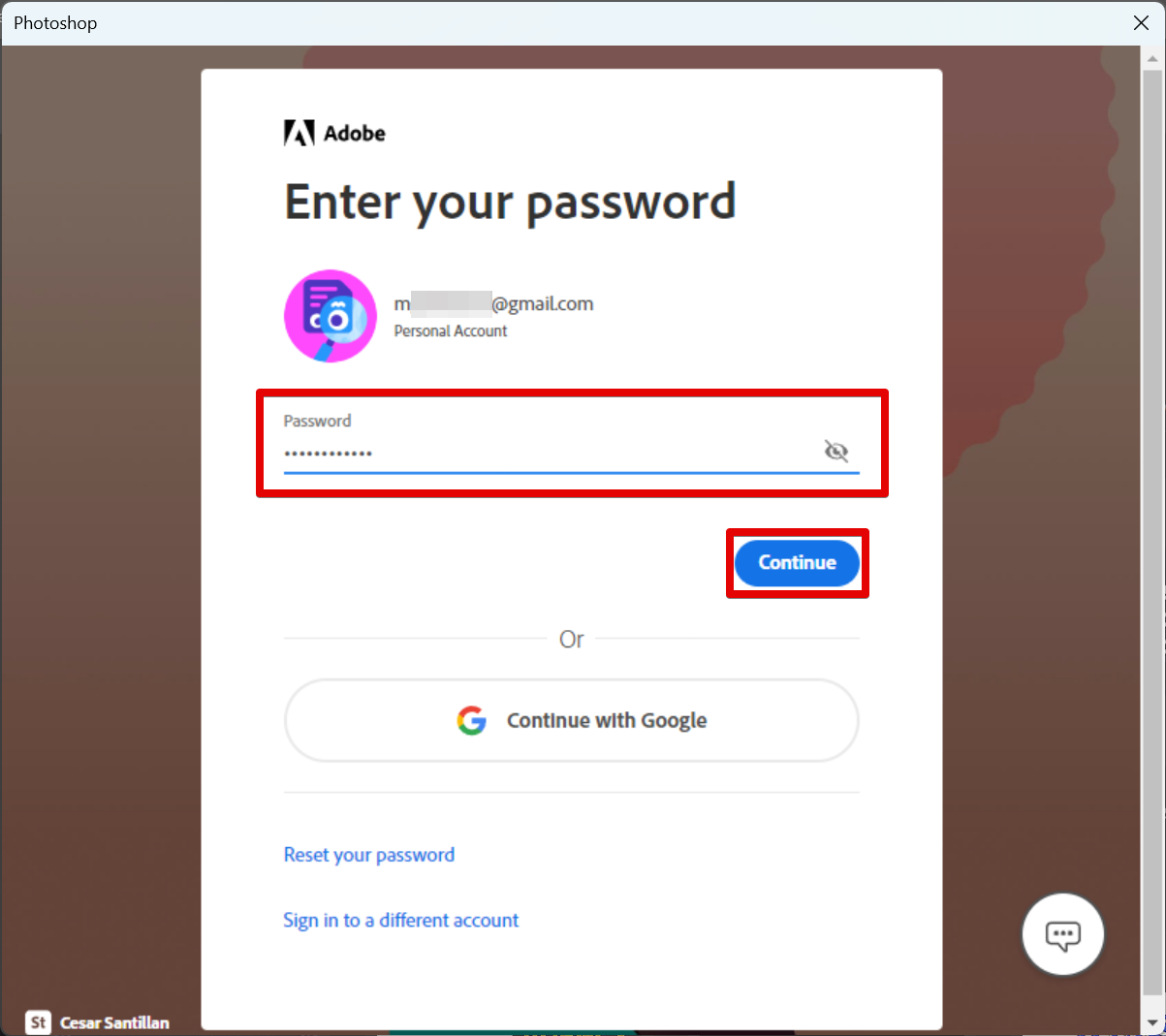 1. Open Photoshop, and a pop-up window will appear, prompting you to sign in to your account. Simply input your registered Adobe email address in the field provided, then click on the “Continue” button.