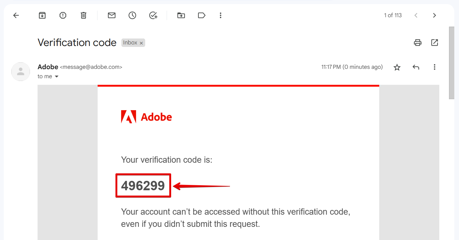 3. Now, go to your email address inbox and check the verification code sent to you by Adobe. Make sure to take note of it.