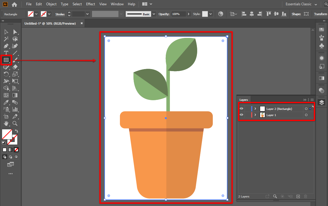 Next, open the file in Illustrator and create a new layer. Use the Rectangle Tool (M) to create a rectangle that is the same size as the file. You can hide the first (artwork) layer file to start working on your rectangle without distraction.