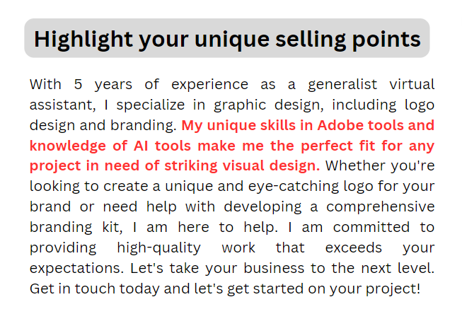 Your profile description is an opportunity to sell yourself and your services to potential buyers. Use persuasive language to convince buyers that you’re the right person for the job. For example, instead of saying “I can design a logo for you”, say “I will create a unique and memorable logo for your business that will help you stand out from the competition”.