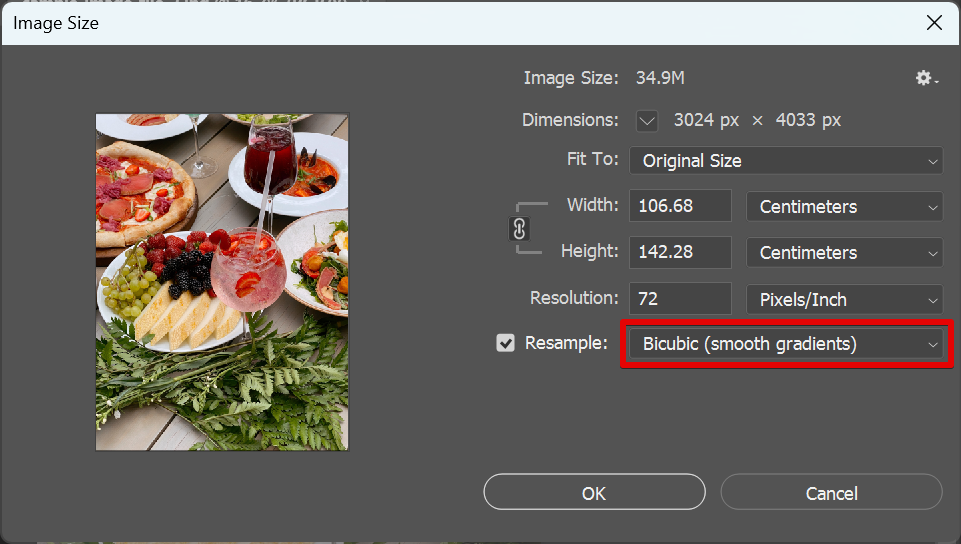 NOTE: The Bicubic resampling method in Photoshop is a sophisticated technique for resizing images, offering smoother transitions than other methods. It’s especially suited for maintaining image clarity and detail when reducing or enlarging photos.